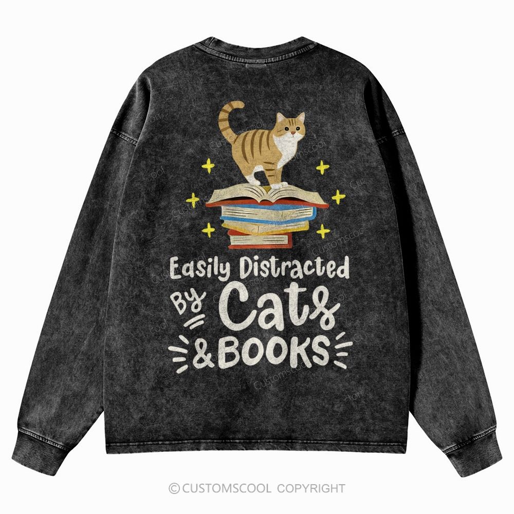 Easily Distracted By Cat & Books Unisex Casual Washed Long-Sleeved T-Shirt Customscool