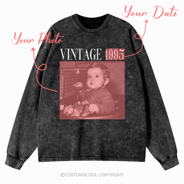 Vintage Addcustom Date Photo Unisex Casual Washed Long-Sleeved T-Shirt Customscool